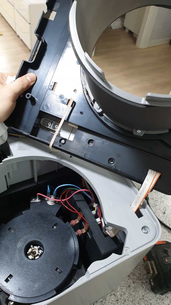 나사못이 여러 가지가 사용되었고 전기장치가 고장 날까 걱정도 되었지만 생각보다 단순하다. 맨 위의 커버를 제거했다. 초파리의 흔적들과 생각보다 많은 수분이 여기저기에 남아있음을 볼 수 있었다. 추측해 보건대 이 모든 부속품에 냄새가 배어 있어 아무리 필터를 교체하더라고 전체적으로 뿜어져 나오는 냄새는 어쩔 수 없는 것 같다.